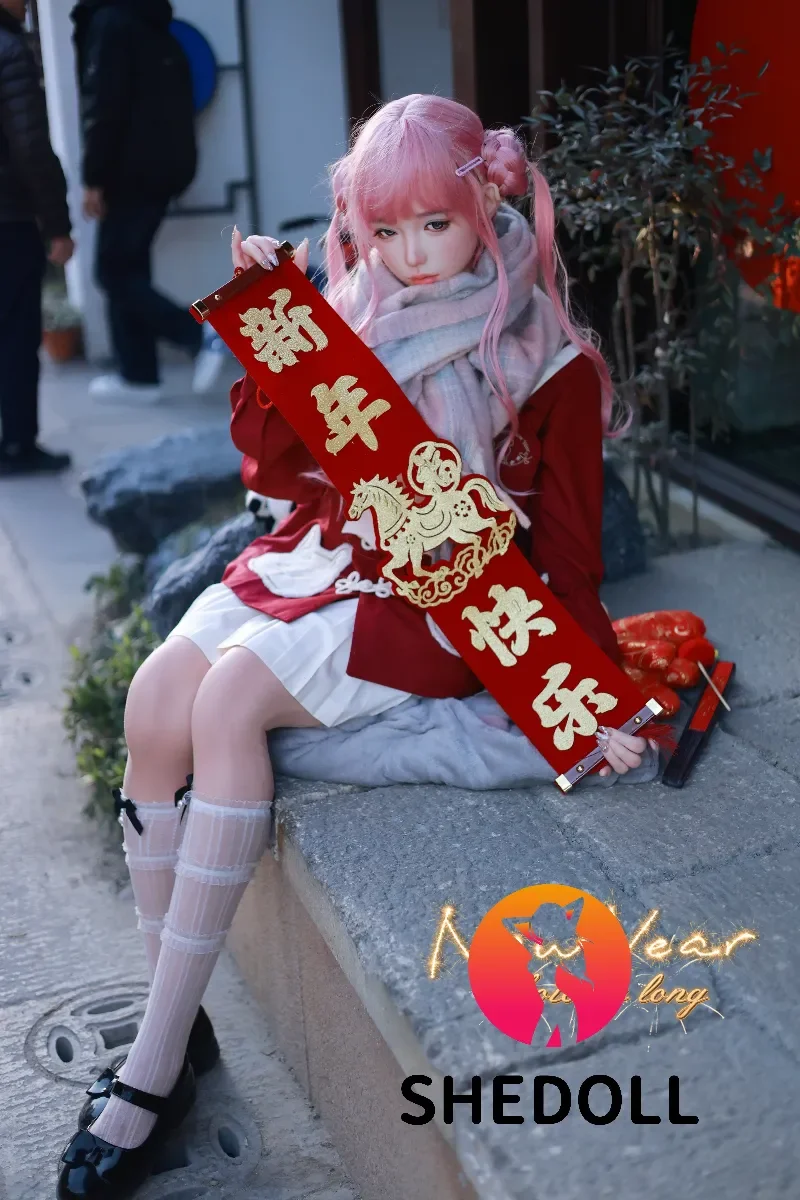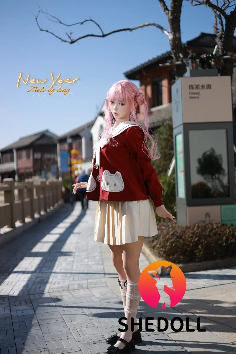 モデルさんは、ピンクの髪がすごく印象的で、ふんわりとした三つ編みが可愛らしさを引き立てています。赤いアウターに白いスカートを合わせていて、冬らしい暖かさと清潔感が共存していますね。首元のチェック柄のスカーフも、全体のアクセントになっていておしゃれです。