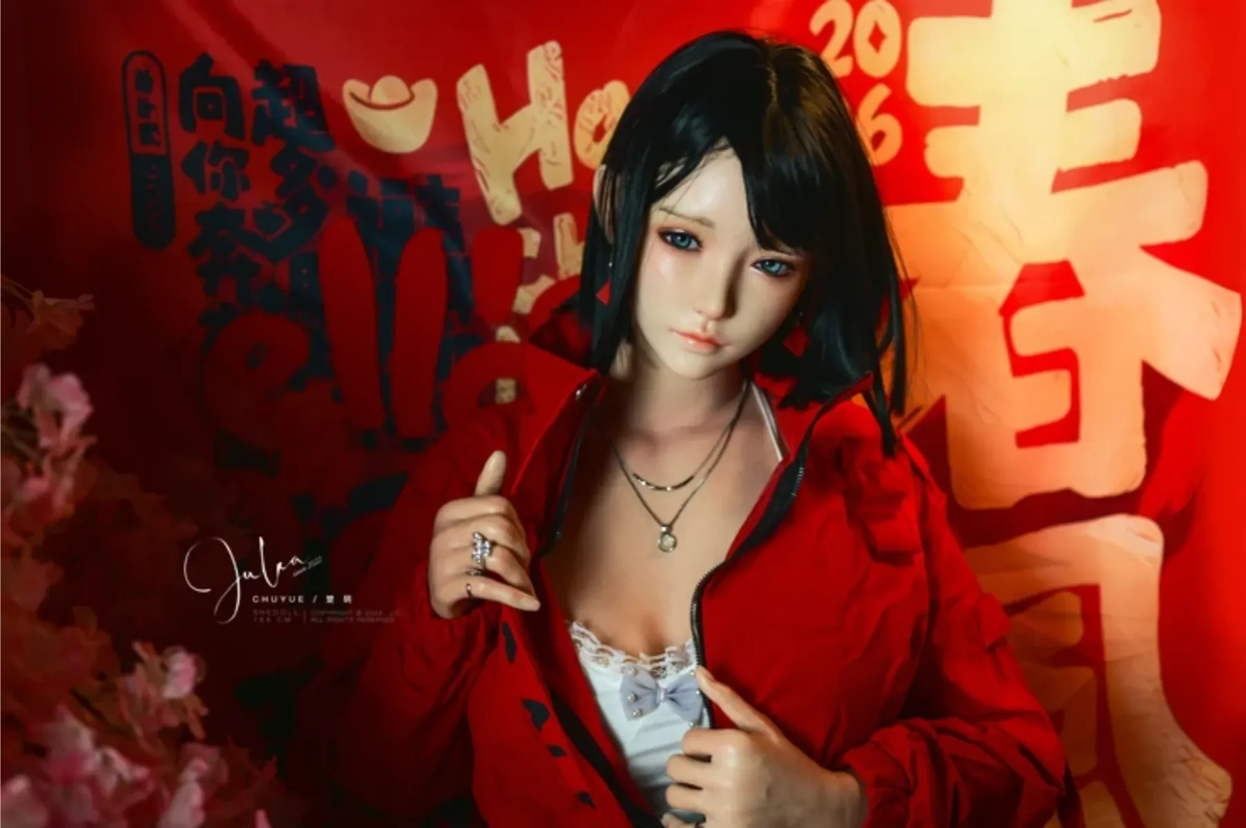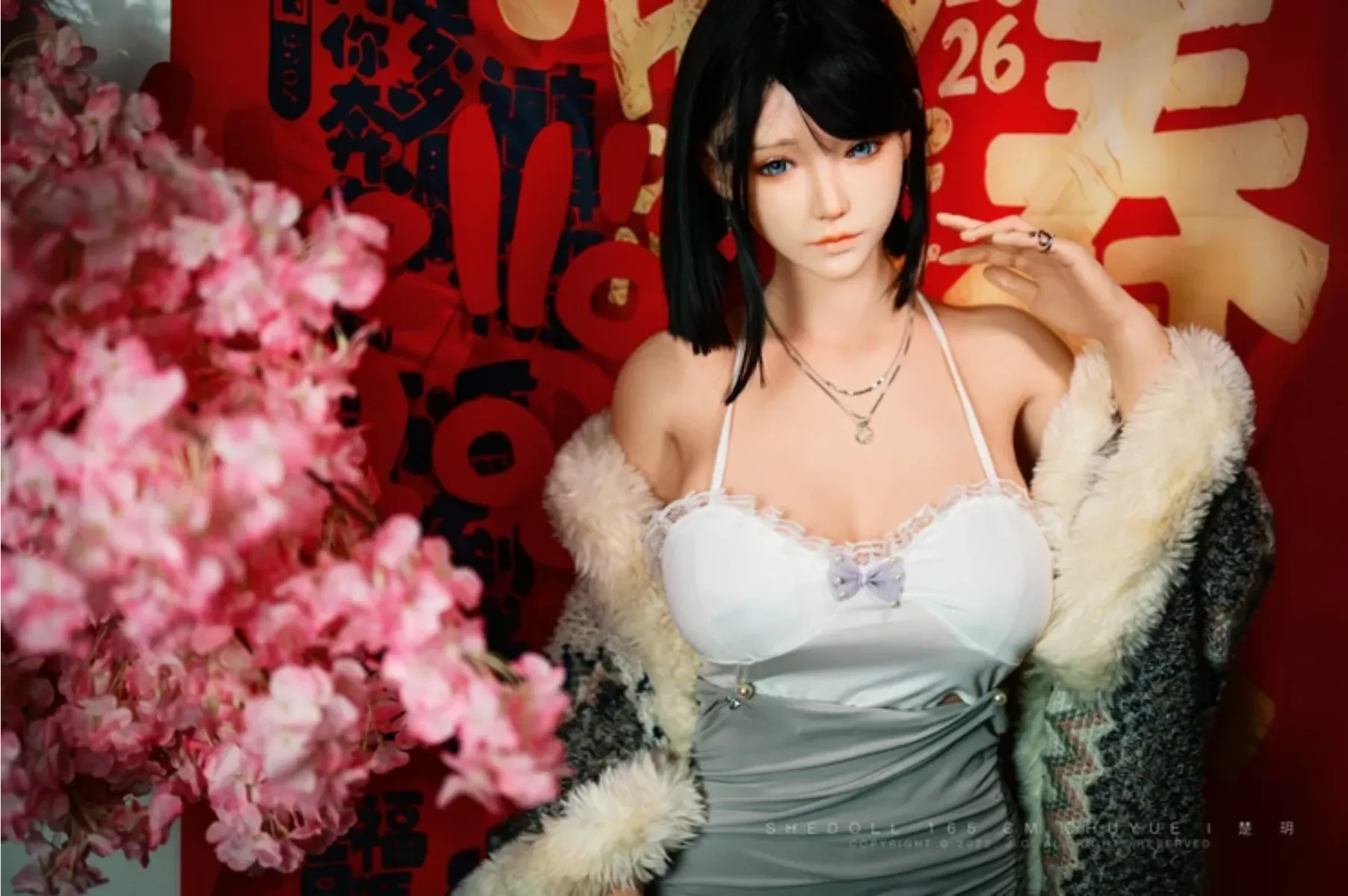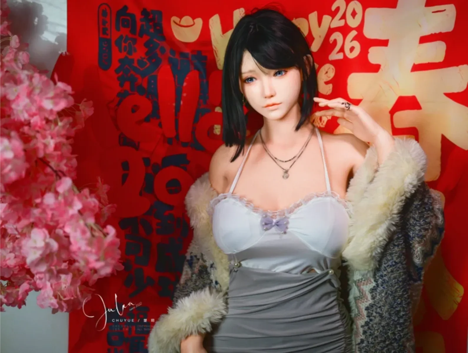 藍眸少女身穿白紗蕾絲襯裙,外披蓬鬆的米白毛絨披肩,像將冬日的雪絨揉進了衣袂。她輕倚在綴滿粉櫻的枝旁,指尖拂過臉頰,耳畔是隱約的年俗低語。背景裡新年分文紅得熱烈,襯得她眉眼間既有清冷的精緻,又藏著初遇新年的懵懂,而她,是這場新春盛宴裡最溫柔的開篇。
