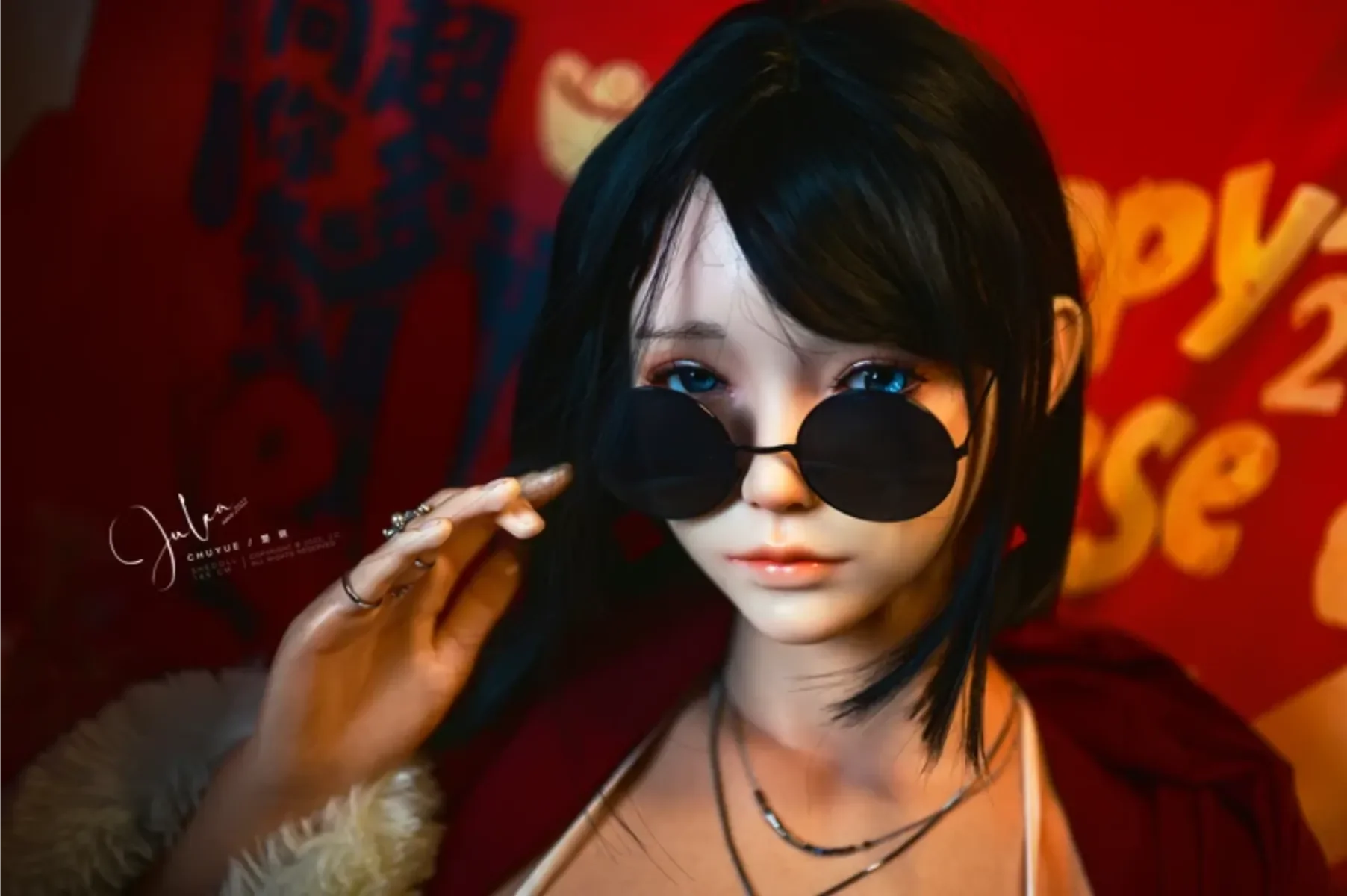 盛典過半,另一位紅眸佳人 登場。她穿著絲絨紅裙,黑絲襯出纖細的線條,銀鍊與紅綢相映,眉眼間流轉著慵懶與嫵媚。她輕倚在紅綢鋪就的軟榻上,周身是漫溢的煙火氣。 「yummy」 的塗鴉與萌趣小熊貼紙,為這份明豔添了幾分嬌憨,彷彿剛赴完一場熱鬧的新春家宴,正獨享片刻的慵懶。